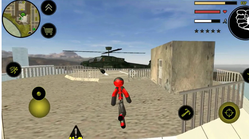 左侧移动、加速,右侧绳索,攻击(跳跃),跳跃,右上侧的武器更换以及血量、经验的显示都实时更新,一览无遗,凭借着大家自由的玩法,与其他帮派的人物进行交火,期间杀人能够获得经验,杀多了会产生星级,警察和其他附近角色会特殊照顾你对你展开火热的进攻,而如何存活,如何将其他人物击杀则是你所需要完成的任务。