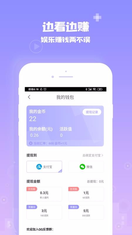 5、在我的钱包界面可以查看赚取金币,随时都能提现使用