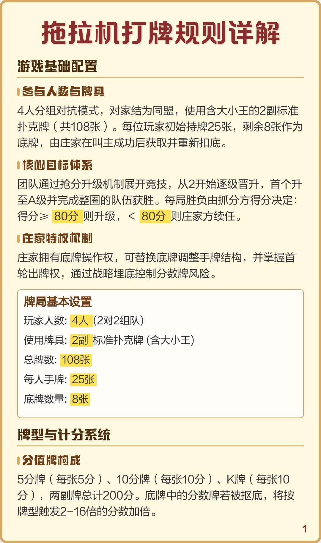 4人两队对抗,用2副108张牌。每人25张,庄家多拿8张底牌可扣底。从2级打起,先打完A级的队伍赢。闲家抓分≥80分就上台,否则庄家连任。