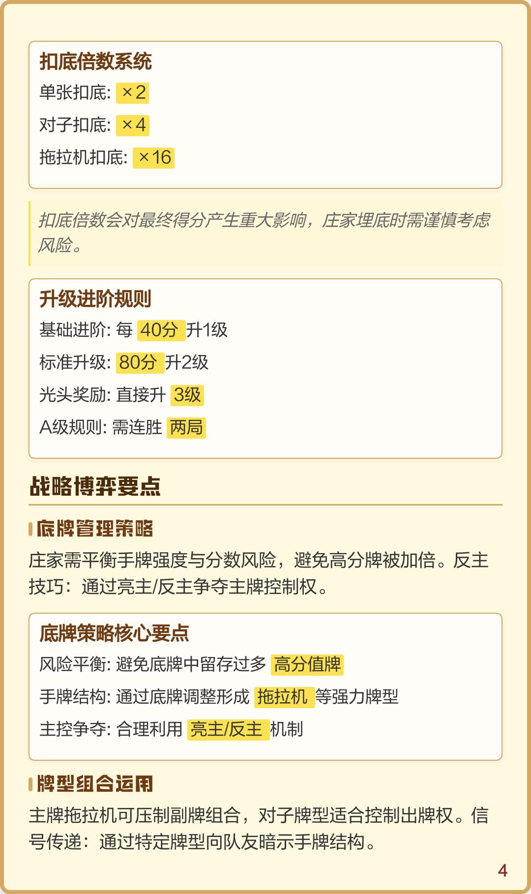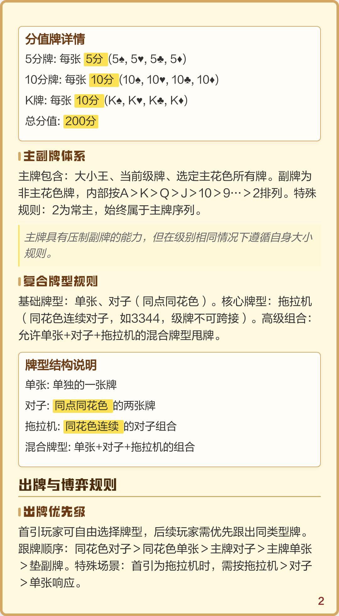 5、10、K是分牌,共200分。底牌若被“抠底”,分数翻2–16倍!主牌包括大小王、当前级牌、所选花色,2永远是常主;其余为副牌。