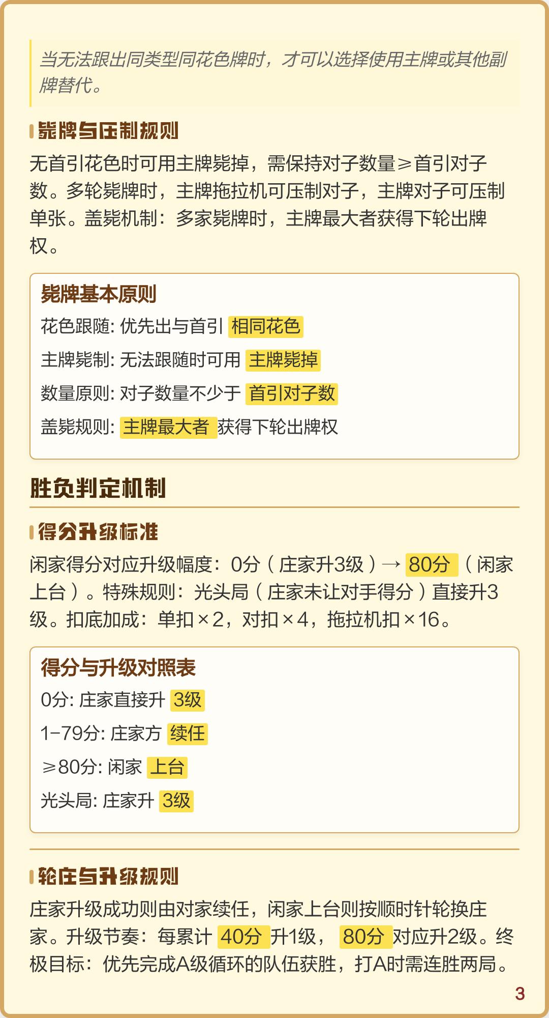 首出定牌型,跟牌优先级:同花对子>同花单张>主对>主单>副牌。没该花色可用主牌“毙牌”,但对子数量不能少。甩牌必须全场最大,否则罚出最小单张。