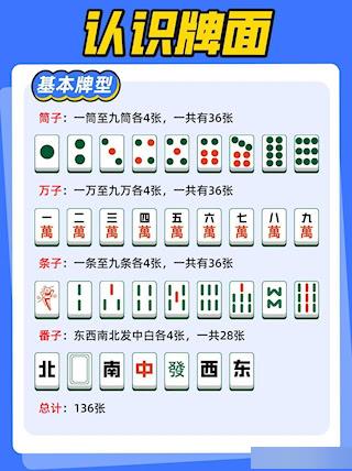 全副136张:筒子(一至九筒)、万子(一至九万)、条子(一至九条),每种各4张共108张;番子(东、南、西、北、中、发、白)各4张共28张。