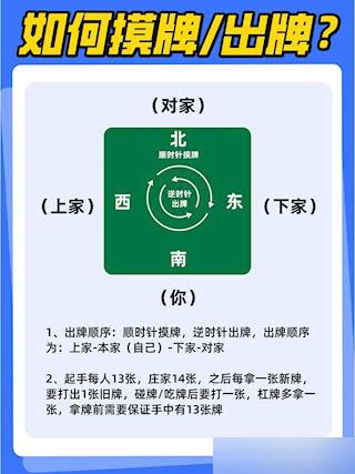 摸牌按顺时针进行,出牌按逆时针顺序:上家 → 自己 → 下家 → 对家,轮流出牌或操作。