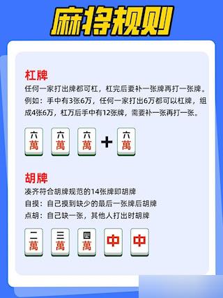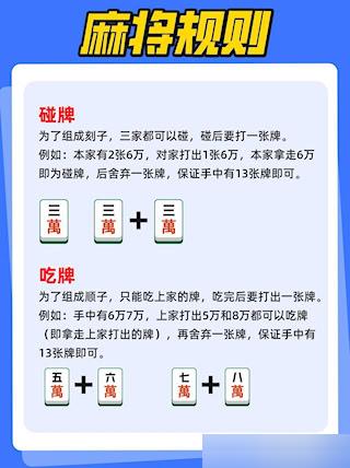 胡牌必须凑齐14张牌,结构为:4组顺子或刻子 + 1个对子。例如:三组顺子 + 一组刻子 + 一对将牌。
