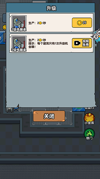4、开上上机摸鱼以后,金币会一点点的增加,可以用来升级电脑和办公室的门。