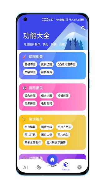 图师傅app是一款手机图片处理软件,更像是一个图像工具箱,在软件中为用户提供了非常多的图片后期功能,包括切图、拼图、裁剪、转换等等功能,你可以在软件中找到自己需要的功能直接使用,让你的图片可以轻松进行处理,做出符合自己需求的图片。