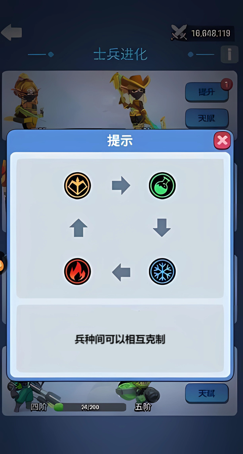 游戏中共有四个兵种,兵种间有克制加成关系,每位英雄都有所属兵种,消耗英雄碎片可对英雄进行升星提升大量战力。