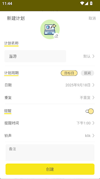2、设置计划名称、提醒时间等属性,点击创建