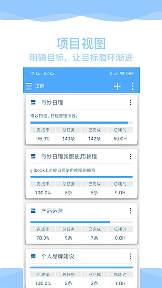 4、项目视图清晰展示进度、完成率及耗时等关键数据