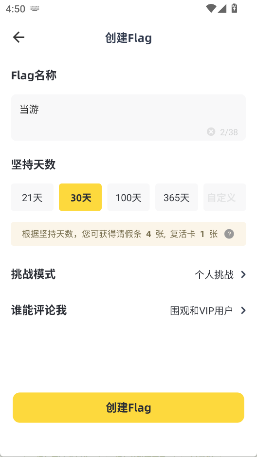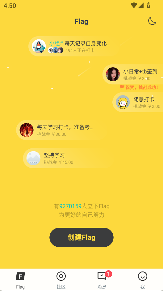 1、Flag创建:可轻松创建各种 Flag,涵盖学习、健身、生活习惯等各方面,详细设置目标内容、时间节点与挑战金金额。