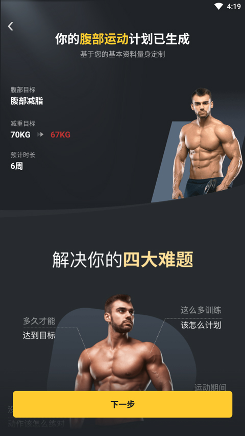 1、打开腹肌撕裂者 APP,需先填写个人身体信息,系统将基于这些资料量身定制腹部运动计划;