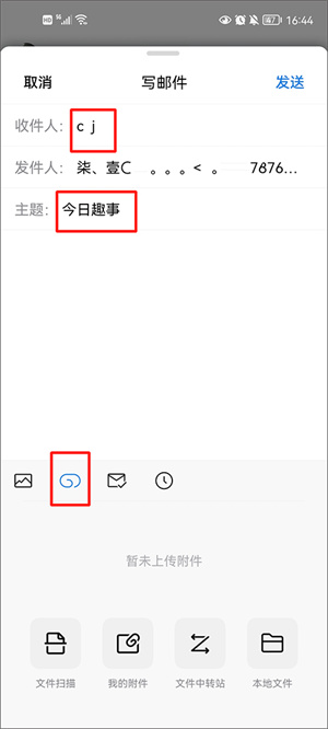 3、在写邮件界面,添加收件人和填写主题以及内容,同时击回形针图标,还能够在附件界面中添加文件。
