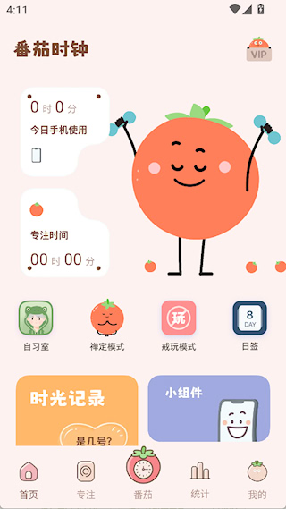 1、打开番茄时钟app,在主页找到“小组件”入口,点击进入