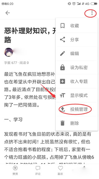 3、 文章页面加载完成后,点击右上角的扩展菜单图标,在出现的选项列表中定位并选择【投稿管理】功能。单篇文章通常拥有向多个专题投稿的机会。