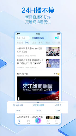 中国蓝新闻是由浙江广电集团推出的新媒体平台。24小时不间断推送国际、国内及浙江本地的热点新闻,涵盖时政、财经、社会、科技、文化、体育、娱乐等多个领域,确保使用者能第一时间掌握最新动态。还提供浙江广电集团旗下多个电视频道和广播频率的实时直播,以及各类精品栏目的现场和点播服务,适应观众不同的观看需求。
