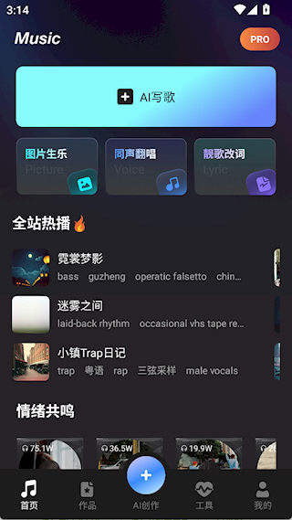 1、打开app,在首页点击+可以用AI写歌,还有丰富的音乐作品可以播放、保存