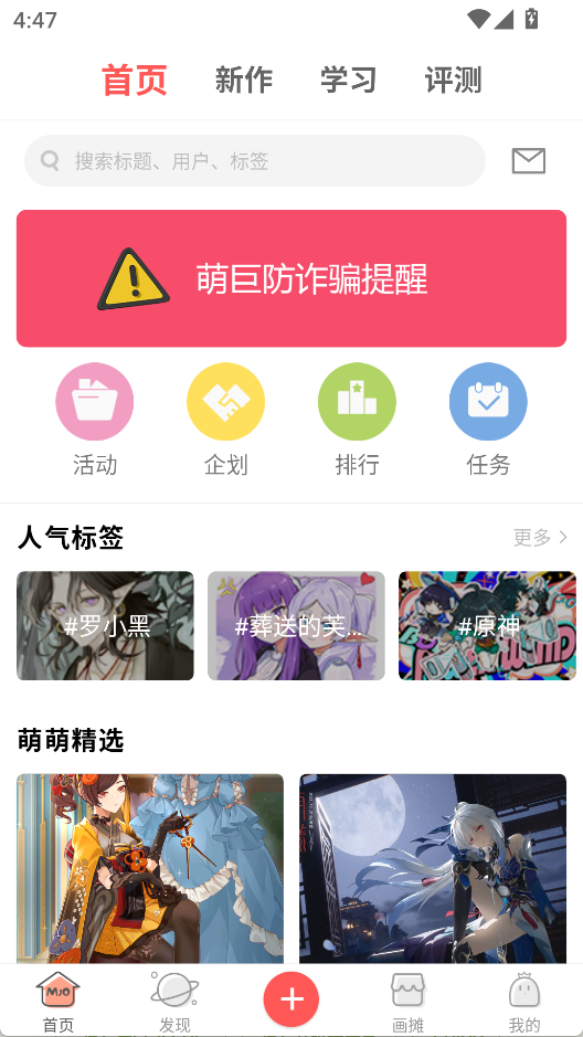 1、作品展示:支持同人、原创、古风等类型画作发布,自动同步 P 站作品,新作板块实时更新热门内容。