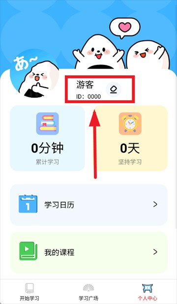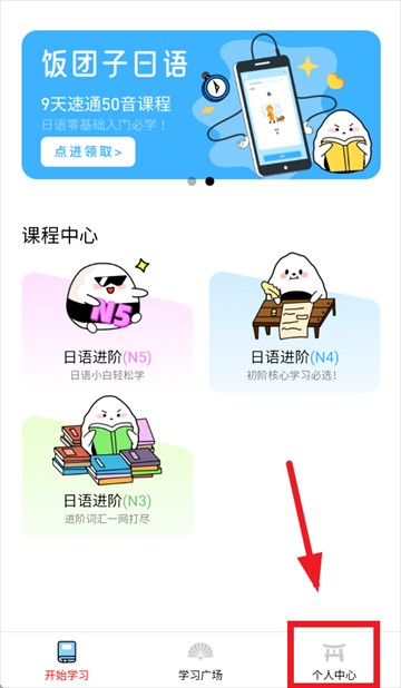 1、下载安装饭团子日语应用,打开后点击界面中的【个人中心】。