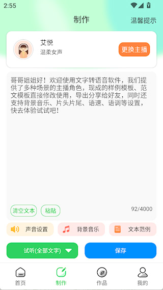 5、简单文本编辑:提供基础文本编辑能力,对输入或导入文字可进行增添、删减、修改,优化内容后再转换语音。