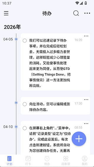 1、计划界面按时间顺序排列待办事项,点击+添加新的待办