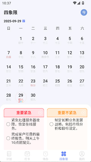 2、四象限分类机制:依据紧急与重要双维度划分任务象限,建立科学的任务处理节奏,规避优先级混淆问题。
