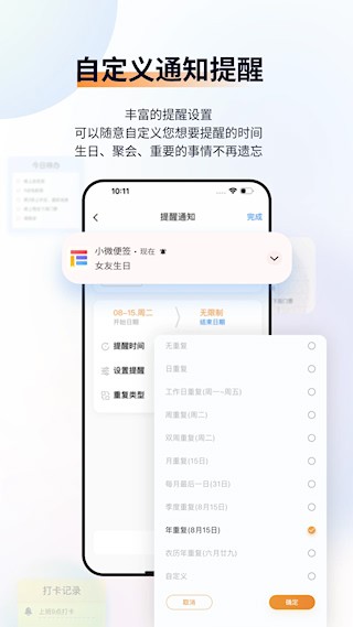 2、自定义时间提醒:提供丰富提醒设置,可按需设定时间,针对生日、聚会等事项发出通知。
