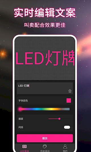 LED手持弹幕工具是一款将智能设备转化为便携式电子展示屏的手机应用。核心功能是生成可全屏滚动的动态文字,通过模拟传统LED显示屏的视觉效果,实现信息的醒目展示。支持对文字颜色、滚动速度、背景效果等参数进行个性化调节,满足不同场景的展示需求。有需要的小伙伴可以点击下载。