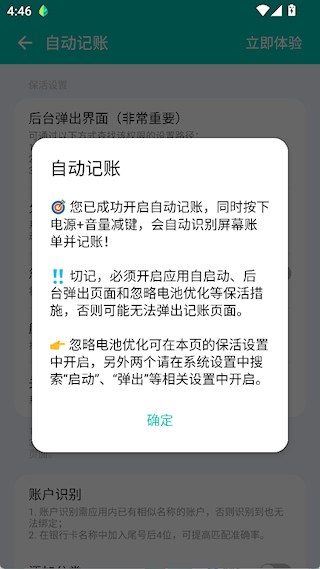 1、修复自动记账不弹出页面问题。在开启应用自启动、后台弹出页面和忽略电池优化等保活措施后,并且不划掉app的情况下,可以确保自动记账服务稳定运行。忽略电池优化可在自动记账页面的保活设置中开启,另外两个请在系统设置中搜索“启动”、“弹出”等相关设置中开启。