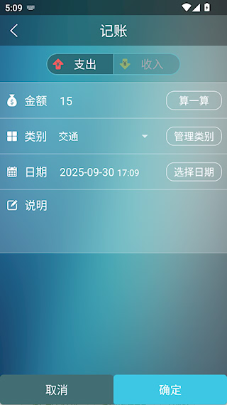 1、快速收支记录:点击记账选项选择收支类型,填入金额、类别与日期即可完成,操作流程简洁直观。