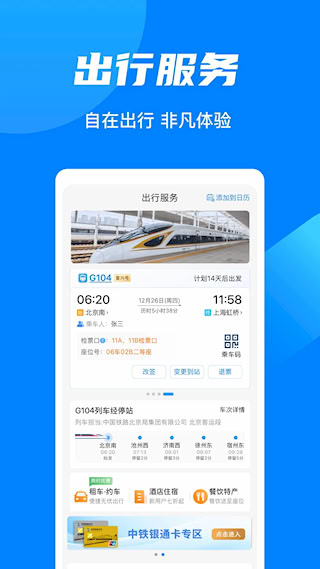 3、 功能设计覆盖出行前、中、后全周期,从购票、信息查询到餐饮住宿、应急服务,形成一个完整的出行服务生态,满足多样化旅途需求。