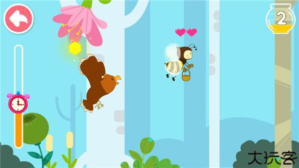 5、飞行途中会出现鸟类天敌袭击,通过方向控制规避碰撞。受击将损失部分花蜜,需重新前往花朵补充采集。