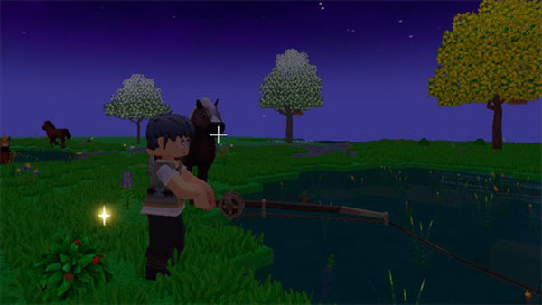 4、钓鱼玩法包含多种鱼类,需自行打造鱼竿、采集饵料,途经溪流或河流时,跳入水中可查看鱼群数量,钓获的鱼可制作或出售。