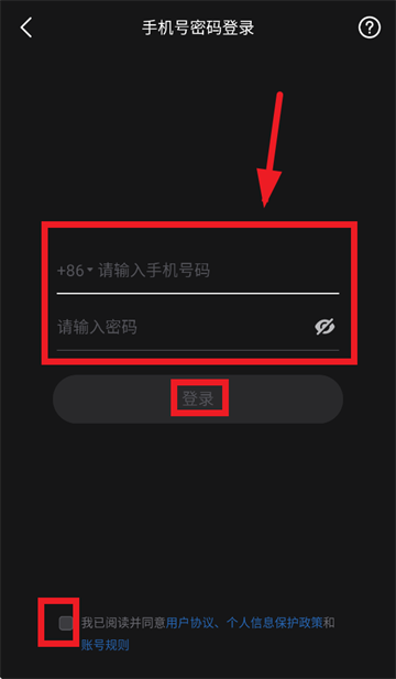 3、输入手机号与对应密码,勾选 “我已阅读并同意用户协议、个人信息保护政策和账号规则”,点击 “登录” 按钮即可完成操作。