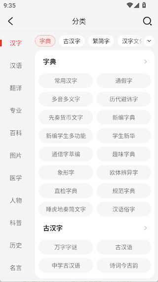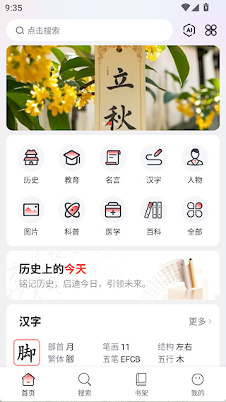 1、首页提供了丰富的内容推荐,如汉字、名言等,点击上方搜索框进行搜索