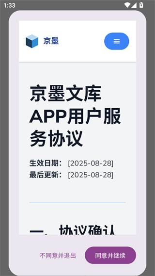 1、下载并安装京墨文库 APP 后,点击【同意并继续】即可进入应用。