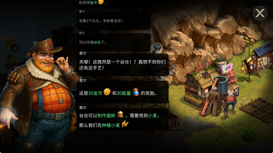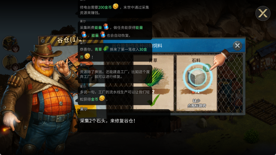 1、进入游戏后点击杂草进行清理获得物资,然后建造各种建筑