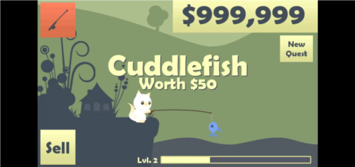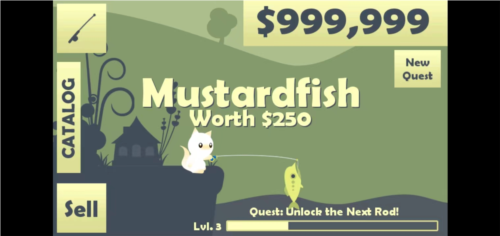 2、钓到鱼后,长按手机屏幕即可将鱼钓起,点击左下角【sell】按钮出售,获取金币。