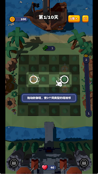 1、进入游戏后,拖动防御塔,使三个相同的塔在一起