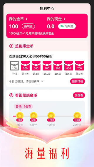 2、通过每日签到与观看视频可获得金币奖励,积累一定数量可申请即时提现