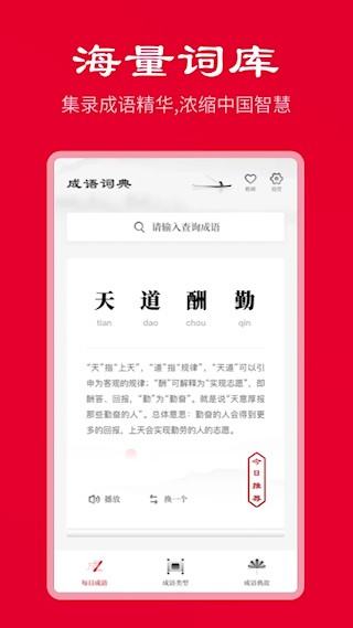 5、每日积累:每日推送精选成语,搭配详细解析,帮助通过点滴积累丰富成语储备量。