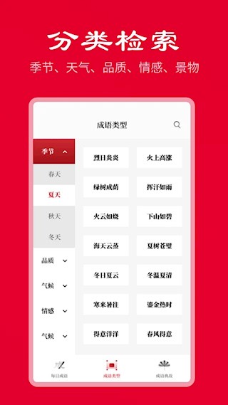 2、分类检索:按季节、情感、景物等多个维度划分成语,构建清晰分类体系,便于按主题快速定位目标内容。