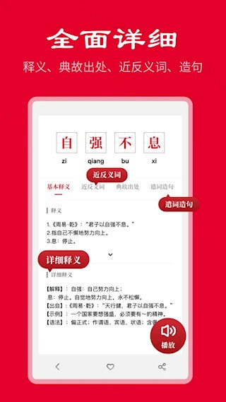 1、词库全面:收录古今各类成语,包含考纲重点条目,每条均配备拼音、释义、出处及近反义词等多维度信息。
