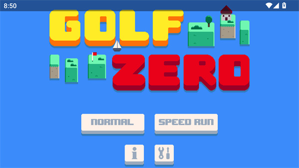 1、在当游网站下载并安装零式高尔夫后,打开运行,进入登录界面;“NORMAL” 为正常难度,“SPEED RUN” 为速通难度,点击下方 “i” 可查看制作者,点击设置可调整音效和音乐。