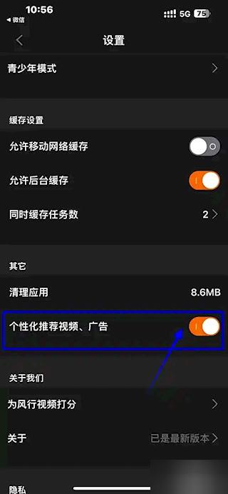 3、在设置菜单中找到个性化推荐功能开关风行视频