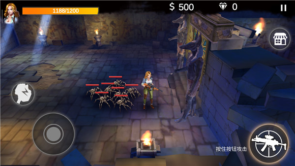 5、点击攻击按钮即可让角色发起攻击,打击僵尸或其他敌人,保障自身安全。