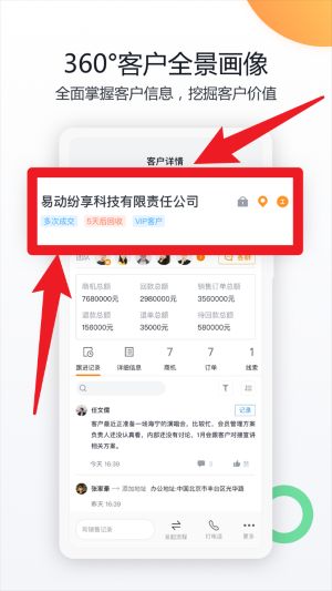 5、在客户详细页面,可查看交易记录及关键标签,帮助全面掌握客户价值与业务进展。