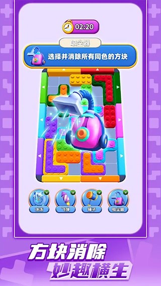 1、方块解谜:滑动屏幕将彩色方块送入对应颜色区域,要注意避开可变色门、移动障碍箱等障碍物。