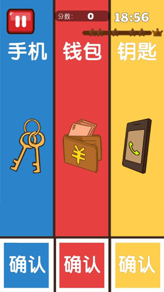 游戏玩法:点击确认所显示的钱包、手机、钥匙与所对应的文字是一致的