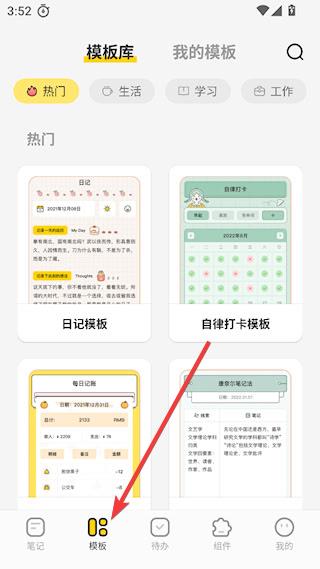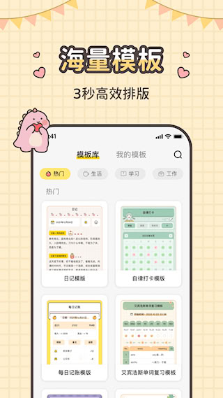 3、返回首页,点击【模板】,提供了丰富多样的编辑模板,主要分为热门、生活、学习、工作四大类