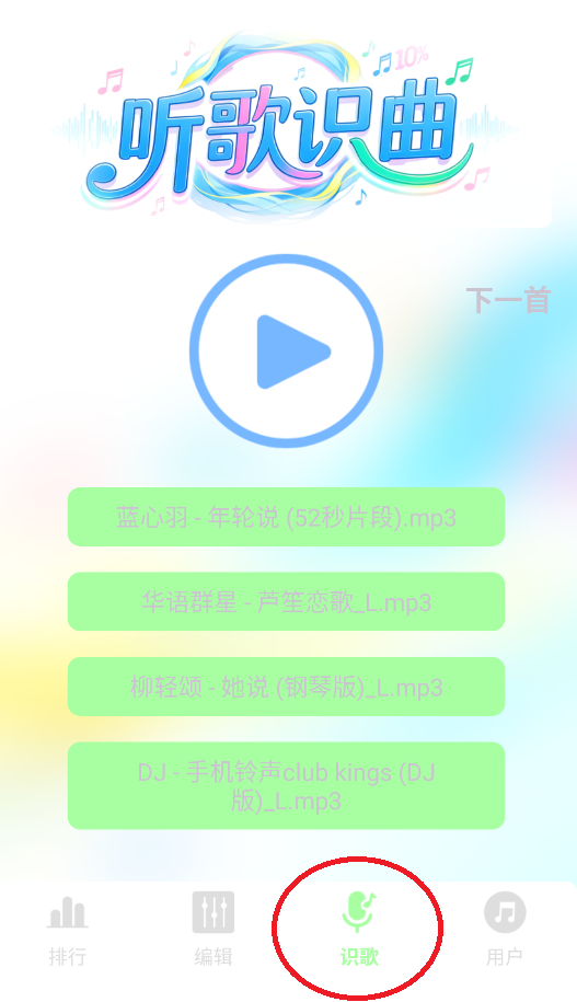 核心界面有一个大型的 “听歌识曲” 按钮。